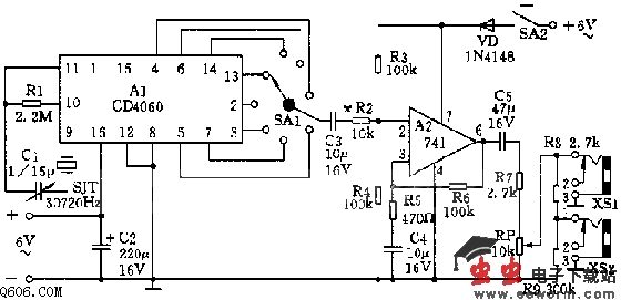 电路原理如图所示。集成电路CD4060是带有振荡器的十四级分频器。晶体SJT产生30720Hz的微弱信号频率,与C1及CD4060内部反相器构成晶体振荡。R1用以提供反馈回路,仅在晶体的基频上产生极荡,振荡中心频率为30720Hz。微调电容C1可使频率精确调谐在中心频率上。SA置于CD4060的13脚。30720Hz经CD4060九级(512次)分频后,由13脚输出高精度60Hz信号频率,经电容C3耦合到运放器741的2脚进行信号放大,然后从741的6脚输出。调节电位器RP时,XS1插口输出0~1V,XS2插口输出0~0.1V的低频信号。