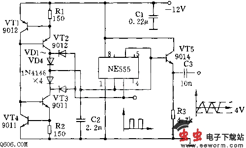 电路刚接通,C2上电压为零,555时基集成电路的2、6脚小于1/3Vcc,其3脚输出高电平(约10.8V),二极管VD4正偏,VD3反偏;VD1正偏,VD2反偏。VT2集电极电流通过VD1向C2充电,当C2上的电压线性增长到2/3Vcc(即8V)时,555的6脚触发,使3脚输出低电平(约0V)。此时VD1、VD4反偏,而VD2、VD3正偏,电容C2上的电荷通过VT3集电极放电,当C2上电压线性下降到1/3Vcc(即4V)时,555的2脚触发,而使3脚复位,输出高电平,如此周而复始,在555的2、6脚便可得到线性度很高的三角波,而在3脚便可得到占空比为50%的方波。