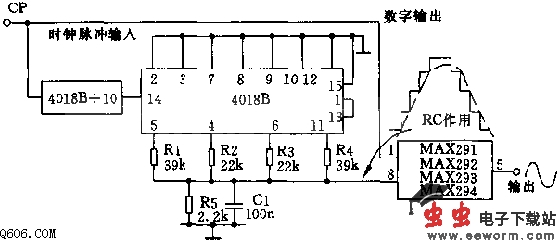 此电路由模拟数字转换器(4018B)和一个固定滤波器(MAX29X)构成。原理如图所示。时钟脉冲输入CP的一部分驱动MAX29X滤波器,另一部分被第一个10位计数器(4018B)分频,再由第二个10位计数器分频,输出的阶梯波经R5和C1的作用使其转变为平滑的正弦波,再经滤波器滤波后输出。