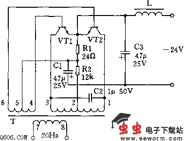 当接通24V电源时,变压器T的线圈L1-2及L2-3中有电流流过,由于电路的非对称性,流经两线圈电流不完全相等,因此,线圈L1-3产生磁通使线圈L4-6感应电势。如果线圈L1-3和L4-6对应端安排使之形成正反馈,则电流迅速上升,使VT1导通,VT2截止,直到磁通饱和。由于磁通不再增加,引起反方向电势而使VT2导通,VT1截止。这样周而复始使VT1、VT2轮流导通和截止,则输出线圈L7-8上产生一20Hz的周期性方波。