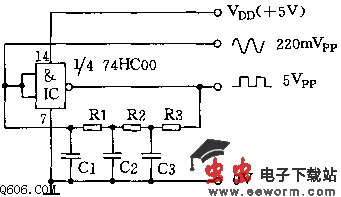 该振荡器频率在100Hz~10MHz范围内工作良好。若用无缓冲输出级的74HCU00代替74HC00效果则更好。