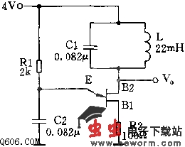 单结晶体管经常用于锯齿波发生器和脉冲发生器中,但用它也可以构成简单的正弦波产生电路。作为分立元件的振荡电路,它使用的元器件可谓最少。 电路如图所示。与普通单结管弛张振荡电路相比,此电路在第二基极上增加了一个LC调谐电路,调谐电路依赖单结管电流脉冲的激励而产生正弦振荡。调节电阻R1,就可以控制电流脉冲的大小,可在B2处得到正弦波。按图中参数,振荡频率为3750Hz,输出电压峰-峰值为2V.