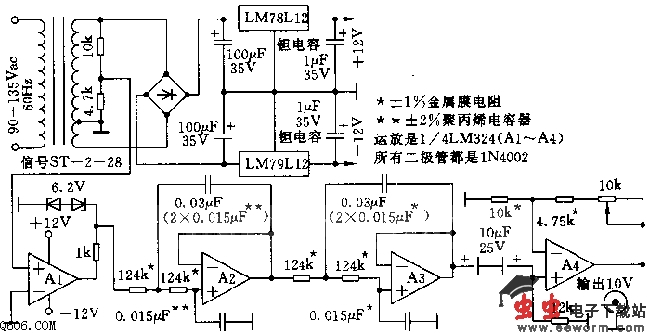 比较器的输出端有一对背对相接的6.2V齐纳二极管。接下是两级Sallen-key型低通滤波器,滤除所有谐波。电容耦合级放大器,隔断因限幅电路中不相等的齐纳电压所产生的直流分量,补偿滤波器的损耗,并且将输出幅度精确地校准到10V峰镇。结果得到一个高稳幅低失真的60Hz正弦波电压。在环境温度恒定的情况下,电源电压变化范围90~135V时,正弦波输出电压幅度变化不大于5mV。