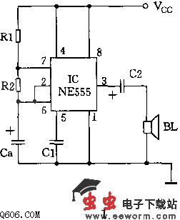如图1是一个以时基电路555为核心,以及周围元件组成的多谐振荡器,其振荡频率f=1/0.693(R1+2R2).Ca,由公式中看到,振荡频率f决定于R1、R2和Ca的大小。改变其中任何一个元件的数值,都会使振荡频率的不同。当R1取4.3k欧,R2取62k欧,Ca取0.01uF时,可以算出f约为1125Hz,若改变Ca容量,振荡频率也会改变。