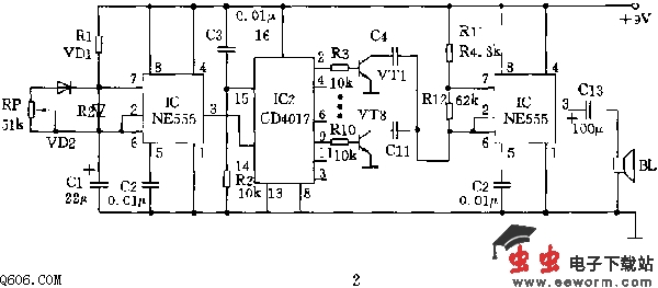 此电路简单,易于装制,不需要特殊的元件,大家不妨一试。IC1与IC3都用双极型时基电路NE555,IC2用CD4017,如图3所示。VT1~VT8用9014等NPN型小功率三极管,VD1和VD2用1N4002,一般RP不简经常调整,用可调电阻即可,其余电阻用1/8W碳膜或金属膜电阻均可以。