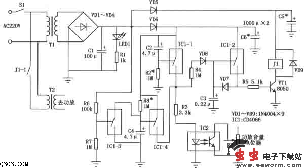 农村的有线广播乡镇广播室用的大功率扩音机容易损坏,其原因主要是使用频繁、无专人管理,往往在最大音量时关机或在全输入状态时开机。此类扩音机多为大输出变压器定压式输出,线路上又有许多线间变压器,如果操作不当,就会在开、关机瞬间产生很高的反峰电压而击穿功放管。采用本电路可在扩音机功放工作前先将输入信号关掉,停机前先将音量关小,从而保护扩音机不致受损。