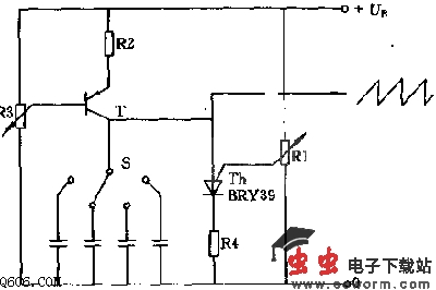 采用有很强负反馈的晶体管T可使电容充电电流近似与集电极电压无关。调整R1可以得到所要求的锯齿波幅度,改变R3可以改变集电极电流并从而调节频率,转换电容值可以在更大范围上改变频率。