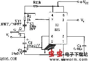 两个耦合电容C1和C2可以避免电路其余部分的直流电压影响VT1.为了不使耦合电容影响555定时器的充、放电时间,耦合电容C1和C2之值为定时电容的值十倍,而同时可以在VT1的D极和S极间得到一个压变电阻Rds,并由此产生可随Vgs变化的占空周期。Rds可变到100k欧。