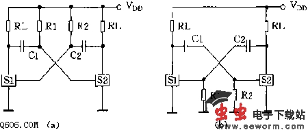 如图是用CMOS的模拟电子开关CC4066组成的振荡器。图中用两只电子开关构成正反馈电路,图a电路振荡比较稳定。振荡频率电阻容元件决定。由于模拟开关在转折电压(1/2Vdd)附近特性良好,因此输出的脉冲前后沿良好。当R1=R2,C1=C2时,电路产生方波,f=1/2RC.