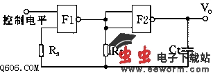 如图是用与非门组成的可控振荡器。在门F1的一个输入端接一个控制电压,组成可控振荡器。当控制电压为“1”时,振荡器工作,输出矩形波;娄控制信号电平为“0”时,振荡器停振,输出停留在低电平状态即无振荡信号输出。