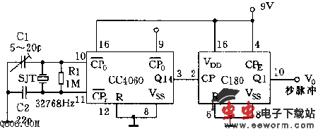 电路中利用CC4060组成两部分电路。一部分是14级分频器,其最高分频数为16384;另一部分是由外接电子表用石英晶体、电阻及电容构成振荡频率为32768Hz的振荡源。振荡器输出级经14级分频后在输出端Q14上得到1/2S脉冲并送入由C180构成的二分频器,分频后在输出端Q1上得到秒基准脉冲。检验电路是否工作,可测得CC4060的9脚有无振荡信号输出。调整微调电容C1可校准振荡频率。