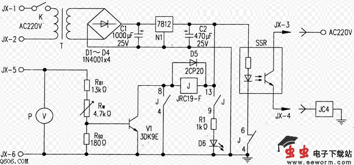 图中JX为本保护小盒接线端子板,固定在小盒上面,JX-1、JX-2接220V交流电源;JX-3、JX-4串接在控制发射机高压Ⅱ挡的交流接触器JC4线包回路中,用此接点去控制本机上高压Ⅱ挡;JX-5、JX-*8V电压取样。K为本小盒工作开关(OFF/ON)。本开关在保护电路动作时,作为复位开关,关一下再合上。T为输入220V,输出交流15V变压器。作为本装置的供电电源。三端稳压电源LM7812输出+12V直流电压。P为新增加的48V电压指示表(满量程100V)。V1为开关三极管(3DK9E),RB1、RB2、RW为偏置电阻(兼取样设置电路),RB1=13kΩ。RB2=180Ω.RW=4.7kΩ。J为小型电磁继电器。型号为:JRC-19F/012M.D5保护二极管(2CP20),D6发光二极管(红色Φ5mm),SSR为交流固态继电器(型号为:JGX-2F)。