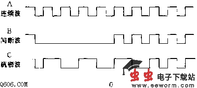 其振荡频率由C2、R12、RP3、RP4来确定,占空比取决于R11.当RP4调至最低端时,再调节RP3,其IC的8脚可以输出不同频率的连续波。当RP3调至最低端,再调RP4,IC的8脚可输出不同频率的间断波,其间断时间由前级的脉冲发生器工作周期确定。同时调节RP3、RP4处于不同阻值时,IC的8脚可输出不同的频率的疏密波,适合于不同要求的治疗场合。其输出的三种波形如图0所示。