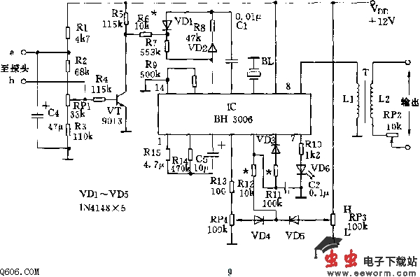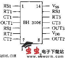 1、2、3脚为第一组振荡器的外接阻容元件端。4脚为第一组振荡器的输出端。5脚为施密特触发器输入端。6、7脚为第二组振荡器外接阻容元件端。8脚为第二组振荡器的输出驱动端,内部具有30mA的驱动能力,如对地开路,使用时需接负载电阻。11、12、13脚为第三组振荡器的外接阻容元件端。10脚为第三组振荡器输出端。9脚接电源的正端。14脚接电源的负端。BH3006集成电路的主要电气参数如下: