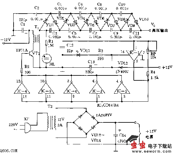 加在VT1的脉冲信号引起开/关作用,造成VT1(小铁氧体磁芯升压变压器)初级线圈中电磁场的起伏,在T1的次级线圈中诱导出极性相反的脉冲信号。把T1次级线圈的脉冲直流输出(在800V至1000V之间)加10级电压倍增器电路,此电路含有VD1~VD10以及C2~C11,倍增器电路把电压提高到十倍,产生的输出电压可达10000V直流电压。通过二极管VD1~VD10和电容C2~C11的反复充放电,倍增器输出将是倍增器中所有电容的一连串相加的和。为了使电路能有效的工作,必须考虑方形波的频率以及加在倍增器的信号。R4、RP和C12的数值规定振荡器IC-1的输出频率(规定数值大约为15kHz)。电位器RP用来微调振荡器的输出频率。振荡器的频率越高,倍增器的容抗越低。