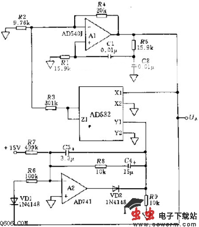 图中示出波形较好的一种正弦振荡器电路,主要器件包括:模拟信号处理组件(内部调整的倍频器)AD532、低失调电压和超低噪声的精密运算放大器AD540J以及低噪声线性运算放大器AD741.这两个运算放大器前者用于调节频率,后者用于调节幅值。频率大小为f0=1/(2RC),R1=R5=R,C1=C2=C。