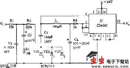 该压控信号V1由低通滤波器R1~R3、C1~C2向变容二极管VD1~VD3提供一个随频率及相位变化而变化的直流电压,该电压由电感L、电容C3、C4及变容二极管VD1~VD3和集成电路IC(CD4007)组成VCO(压控振荡器)的输出频率。