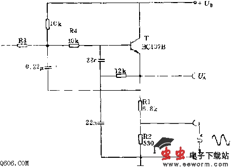由于从射极跟随器中输出,故输出电阻很低。输出电压值可由R1、R2分压电阻值的选取来决定。如果要想得到无畸变正弦信号的工作点,则可接入电阻R3,其值由实验调整确定。在电路参数情况下频率约为500Hz。