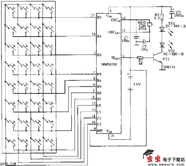 如图电路采用RES1 CSB 455A型陶瓷谐振器产生载波频率振荡信号。键盘输入并经MM58250集成电路处理的调制信号由引脚4输出,最后由晶体管VT1放大,推动红外发光二极管VD1和VD2发射出红外光线。电路中键盘采用4X8矩阵结构。