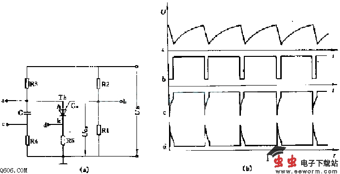 利用程控单结晶体管Th可构成有多种波形输出的脉冲发生器电路。图b示出从图a电路中a、b、c、d各点输出的脉冲波形。