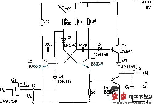 由晶体管T1、T2组成多谐振荡器,与固定电阻Rl串联500欧可调电阻用来调整频率。晶体管T3和T4组成输出级,输出电流Iq在低电平Uql=0.4V时大于48mA,在高电平Uqh=2.9V时大于20mA。