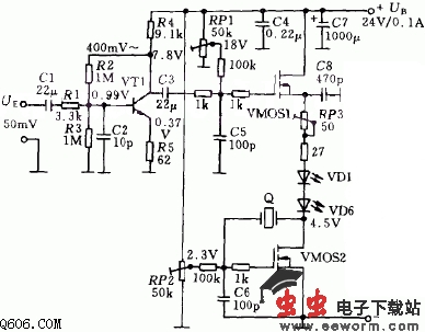图中示出由石英晶体振荡器产生载波信号的电路。振荡器由晶体Q和VMOS场效应管及少量外接元件组成。低频调制信号Ue经电容C1加至放大器VT1上。载有载波的被调制信号最后经场效应晶体管VMOS1放大由红外二极管VD1~VD6发出。