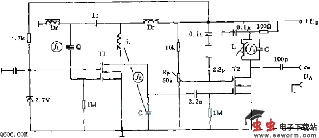该电路中扼流圈Dr根振频率范围来选择,以保证wL>0.5k欧。石英晶体频率可选到70MHz(5/7泛音)。在此频率下f2决定于LC回路参数。在C(吸收回路)上形成较高的电压,以控制后接的晶体管。在输出端的频率f3可通过选择适当的L-C值使之调整到所希望的f2(或f1)的倍频上。