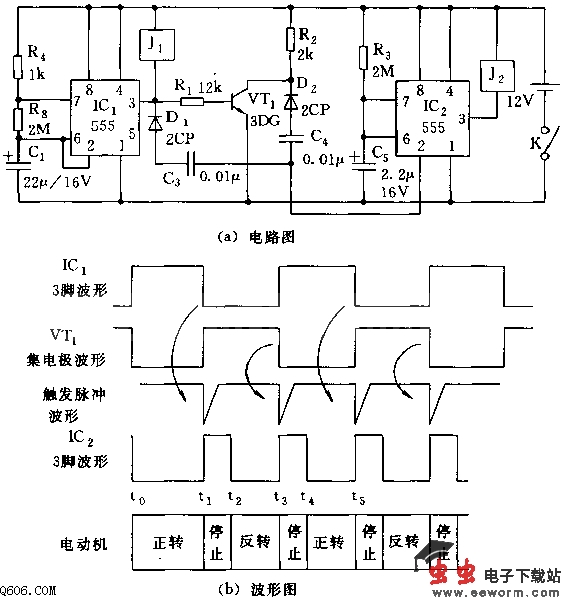 IC1和R4、R8、C1等组成无稳态多谐振荡器,振荡频率f=1.44/(R4+2R8)C1.IC2和R3、C5组成单稳定时电路,暂稳时间为Td=1.1R3C5,它受IC1和VT1输出的负向脉冲的触发,输出一定宽度的脉冲。在t0~t1时段,J1释放,J2吸合,电机正转;在t1~t2时段,J1吸合,J2释放,电机停转;在t2~t3时段,J1释放,J2吸合,电机反转;在t3~t4时段,电机停转。如此控制,便可实现电动机的正转和反转。