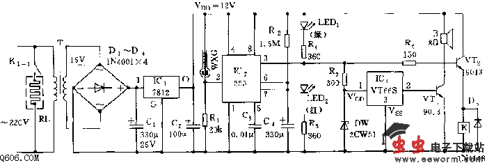 图示参数设计为9分钟(计算值544秒)。可根据温室的需要来调节时间常数RC,从而改变电加热器的通电加热时间。随着电加热器的通电、升温,温度计的水银膨胀,使电接点又与水银界面接触而导通,555的2脚又转呈高电位而复位,往返循环,保持室温在一定的范围内。在继电器吸合的同时,音响及发光电路得电,进行声、光报讯,提请主人注意。在正常温度范围内,LED1发绿色光;在温度低于设定温度并在加热期间,LED2发红光。