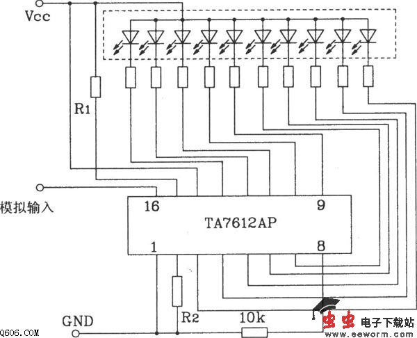 TA7612AP构成一条10点共阳极型对数显示驱动电路此电路输入信号为模拟电压输入,对数刻度显示。