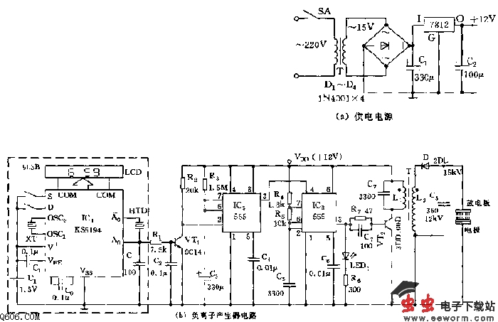 负离子定时产生电路由电子钟组件、单稳态定时电路、振荡器、升压驱动级及高压放电产生器等组成,如图所示。