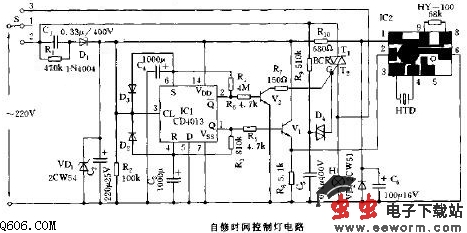 此电路两种功能的转换由S控制,S是一个单刀三掷转换开关。其置1位时,电路全部关断,用于常关状态。S置3位时,用于台灯常开状态,此时台灯可全光长时间照明。