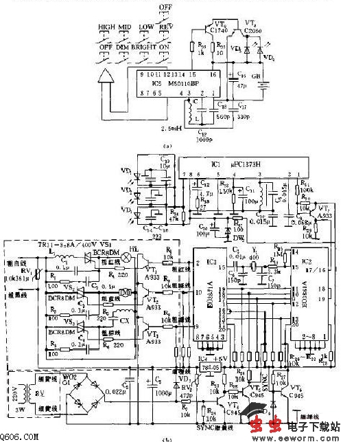电路中VT4、VT5从桥堆整流后取出脉动直流电(未经滤波)经放大后给IC3的12、16脚提供同步信号,凡是双向可控硅都必须由同步信号来控制其开闭,在这里则主要与控制指令一起作用于VT1~VT3,使其准确地控制可控硅VS1~VS3的开闭及导通角,其中VS2更有正半周导通或负半周导通的功能,以控制风扇的正转或反转。执行电路中的压敏电阻及C1~C4、R3~R2等组成阻容吸收回路。