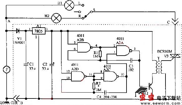 电路中与非门A2A、A2B和电阻R1及C3组成高频振荡器,其输出接在V2的基极;A2C、A2D、R2、C4组成低频振荡器,控制与非门A2A的一个输入端1的电平。当低频振荡器输出端10脚为高电平时,A2A打开,高频振荡器起振,A2A信号加在V2的基极,使其工作在开关状态。V2的发射极接到高频变压器T的一次线圈,在其二次侧产生一系列高频脉冲信号。该信号触发双向晶闸管V3导通。当低频振荡器输出端为低电平时,A2A的输出端3为高电平,V2、V3截止。当低频振荡器输出端又变为高电平时,V3又变为导通。这样周而复始地振荡下去,V3将断续导通。如转向开关S打到左(L)或右(R)位置时,由于V3的断续导通,使得转向灯也断续发光而产生闪光效果。若在V3的阴极或阳极并联一个扬声器,则在转向时可发出声响,并提醒驾驶员在转向后不要忘记关闭转向灯。