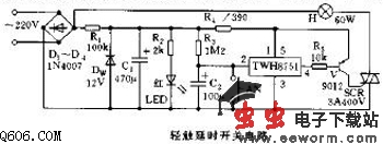 元件选择:TWH8751要求漏电流要小,R5阻值不可太小,三极管V的B值不可太高;否则三极管V会因TWH8751的漏电流大,三极管放大倍数大而误触发可控硅,电灯H常亮,其余元件按图选用。