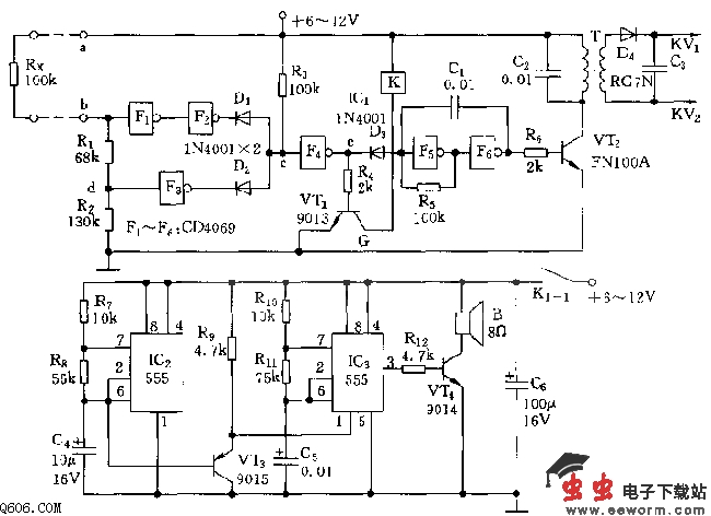 如图所示,本电路用于门、窗、提包、钱柜等处的防护,采用“权”电阻密码进行真、假识别。当a、b间出现短路或断路时;“权”电阻Rx阻值增大或减小,导致F4门电路(e点)出现高电平,使VT1导通,继电器K吸合,将音响电路电源接通,发出双音报警信号。与此同时,由于D3截止,由F5、F6组成的约3000Hz的音频振荡器开始振荡,经由VT2和升压变压器T组成的放大器将音频信号升压,并整流,产生近万伏的高压,电击行窃者。