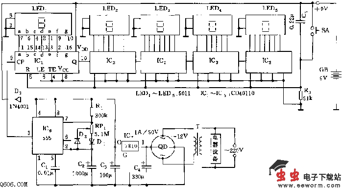 IC1~IC5采用CD40110,它是集计数、锁存、译码及显示四种功能为一体的CMOS集成块。在电器通电工作时,555有电压供给,每隔1小时输出的正跳变脉冲作为IC1的触发脉冲,经IC1~IC5逐级计数、译码、驱动,便在LED1~LED5显示出电器的累计工作时间。在电器因断电不工作时,555无供电电压,555的3脚呈低电平,译码器不计数,但数码管仍显示已累计工作时间。最大累计时间达99999小时。