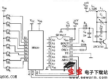SB1~SB8为遥控控制键,按下其中任何一个按键,SR830三个输出端均会输出一组编码,同时使Vdd变为12V,Vcc变为5V,从而QCH417开始工作,将编码发射出去。由SR830产生的三位编码送到QCH417的A9至A11端,也作为编码信息,从而使每个按键的发射编码不一样,即每个按键只能控制一个控制对象。