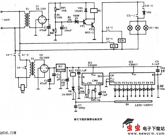 与此同时,电源变压器T2的次级有低压电,经全桥U2整流后,电容器C3滤波,又经IC1稳压成9V直流电供给定时器电路工作。在这里,IC2构成一个14级二进制分频电路,产生周期为3600s的脉冲输出,此脉冲每隔3600s一次输入到十进制计数器/分配器IC3中,IC3每接收到一个脉冲,其输出端高电平顺移,调节S0可以任意设置高电平点,该IC3的输出端共有10个,故可定时10小时(最长)。一旦预置点变为高电平时,则单向可控硅VS触发导通,并自锁。VS导通后,K3吸合。K3吸合后,其常闭触点K3-1断开,K2释放,CJ1释放,CJ1-1断开。与此同时,K3-2触点闭合,交流接触器CJ2吸合,其触点CJ2-2闭合,使串入二极管VD2的支路接通,此时由于回路中串入了一支VD2,故电流成半波供给,使灯光减弱,电压几乎降压了一半,假如街灯傍晚7:00接通,经过6小时全额照明,已到了凌晨1点钟,此时电网电压有所升高(因此时电网的负荷已很小),且街上几乎无行人走动,此时应该将供电电压下降,有利于保护灯具和减小能耗,在这种半额供电情况下,一直延续到第二天早晨天亮,强烈的光线照射在光敏电阻RD上,又导致VT1截止,K1释放,后缀电路全部断电,照明灯自动熄灭。