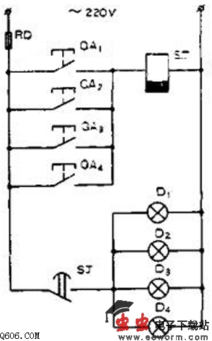 如图为楼房走廊照明节电线路,当人走进楼房走廊时,按下任何一个按钮,SJ时间继电器戏合,使SJ延时常闭点闭合,照明灯点亮。然后行人开始行走,待走到室内后,延时常闭点经过了一段时间后打开,使走廊的灯自动熄灭。