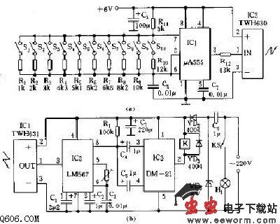 电路原理:该遥控灯电路是由一只10路无线电遥控发射器和10只无线电接收控制器共同构成的。10路遥控发射器的电路如图所示。电路中主要电子器件是一只无线电遥控发射专用模块IC2(TWH630)。它是一种不用外接天线的微型发射头,工作频率为265MHz,工作电压为6~12V,工作电流为4mA,发射范围100m。具有传输距离远、抗干扰能力强、无方向性等优点,可在室(院)内任一位置遥控每一个房间电灯的开关。时基集成电路IC1(uA555),遥控按键开关S1~S10,电阻R1~R11、电容C1~C2组成振荡电路。S1~S10按键对应10种不同频率的方波脉冲信号,当需要开关第一盏电灯时,按一下S1,IC1 3脚输出的方波脉冲信号经电阻R12送入IC2的IN输入端,在其内部调制放大后,由内置天线将高频调幅波辐射至空中。