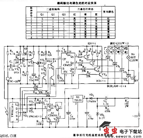 灯光变色控制电路主要由A1(CD4520)极其外围元件组成,A1是一块具有同步加法计数功能的CMOS集成电路。当给它的触发端CP输入时钟脉冲(下降沿有效)时,Q1、Q2、Q3三个输出端的状态即发生规律性组合改变,使对应的红、绿、蓝三个彩色灯泡跟随亮灭,根据光源“三基色”调色原理,室内便会产生七种色光,具体情况见图表。