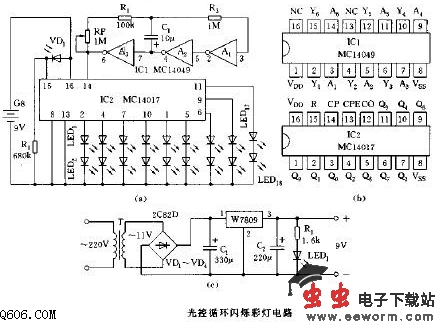 电路原理:图a是其电路原理图,IC1为六反相器MC14049集成电路。其中A1~A2组成多谐振荡器,振荡周期由电位器RP调整,调整范围为1~10s之间。IC2为MC14017构成计数器,白天,由于光电二极管VD1呈低阻,IC2的15脚呈高电位,而呈复位状态,Q1~Q9均输出低电位,发光二极管LED1~LED18不显示亮光。夜幕降临光电二极管VD1呈高阻抗,15脚呈低电位被触发,时钟脉冲送入IC2 14脚,则IC2的9位输出端Q1~Q9依次输出高电平,发光二极管LED1~LED18按顺序闪亮。从Q1~Q9闪亮一周后,全灯熄灭片刻后,又重新开始循环。