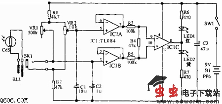 本电路是一基本的LDR桥式电路,VR1是LDR的可变负载电阻。在进行测量时,高输入阻抗的运算缓冲器IC1A和IC1B可保证忽略LDR和VR1接入的影响。IC1C是电压比较器,它可以控制红、黄发光二极管的亮度。在零点处通常LED会从红色转为黄色,或者从黄色转为红色,以此提供连续的对VR1和VR2的照明度。