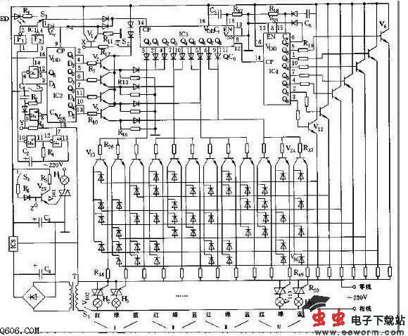 电路原理:图中IC2为包含6个D触发器的CMOS集成电路CD40174,6个D触发器共用时钟端CP和复位端Cr,当Cr端为低电平时,6个D触发器的输出端Q1~Q6均复位至零。IC3和IC4为CMOS十进制计数/分配器集成电路CD4017.