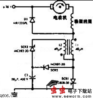 可控硅SCR1与琼斯斩波器结合在一起,可以平稳加速高尔夫电瓶车或其它的由36V车载蓄电池供电的电动车辆。2马力,36V串激直流电动机的正常工作电流是60A,爬坡时的起动电流高达300A.斩波器和它的控制电路给电动机提供很大的平均电流,但又能限制峰值电流的大小。其办法就是在需要很大转矩的时候,使斩波频率从正常的125Hz提高到500Hz。
