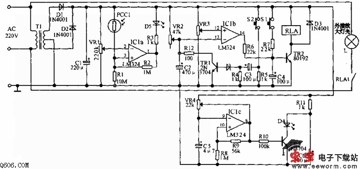 本放大机计时曝光器可以打开放大灯光,其时间可任意控制在1~20秒内,还设置每秒闪光一次的发光二极管,这对于暗室的计时非常方便。电路由比较器、计时器、脉冲计时器构成。比较器用来估计曝光时间。校准VR1就可测量出落在PCC1的光量。计时器由VR3调校基准电压加在IC1b的同相输入端。C2放电时,IC1b输出处于高电平,TR2导通,继电器动作,接通放大灯光。此时电源通过VR2对C2放电,C2两端电压超过基准电压时,IC1b输出低电平,TR2截止,继电器释放,灯光熄灭。按动按钮S1可使继电器通断,以控制灯的明暗,便于工作人员对工作台上的影像进行聚焦调节。按动S2就启动计时时间。它使TR1在其基极接受一个短促的脉冲而导通,因而C2经由R12放电。S2放开后,C3放电,C2开始充电,即开始计时。脉冲计时器是一简单的振荡电路,通过调节VR4使D4的闪光频率为1Hz。