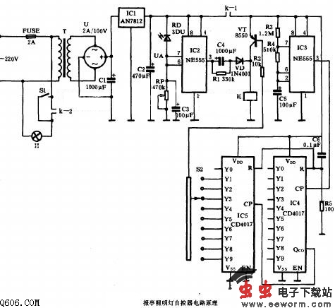 当预订的时间到,由IC5 Y1~Y9的某一档跳变为高电平,此高电平通过R2加到三极管VT的基极,使其反偏而截止,于是K失电释放,常开触点K-1、K-2均断开,照明灯自动熄灭,达到自控目的。