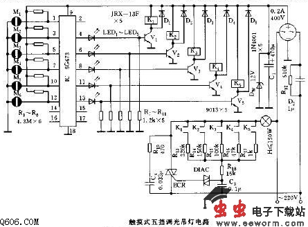 元件选择与调试;IC采用5G673,它应使用负电源,但只要将9脚接正12V,18脚接地,即可在正电源状态下工作。发光二极管LED1~LED5均采用3mm红色管。V1~V5采用9013或8050等,继电器K1~K5采用JRX-BF,用12V的4100或4098也可。DIAC采用DB3双向触发二极管。BCR视吊灯功率而定,一般采用3~6A/600V即可。M1~M6为六块触摸片。用镀铬金属片粘在塑料面板上,连好引线即可。