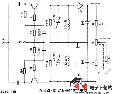 如图是某微波通信机采用的双失谐回路鉴频器的实际电路,它的谐振频率是35MHz和40MHz。调频信号经两个共基放大器分别加到上、下两个回路上,而两个回路的连接点与检波电容一起接地。这与前面电路不同。由于接地点改变,输出电压Uo改从检波器电阻中间取出,它是由检波电流I1和I2决定的。因为检波二极管D1和D2的方向是相反的,所以Uo决定于两个检波电流之差。